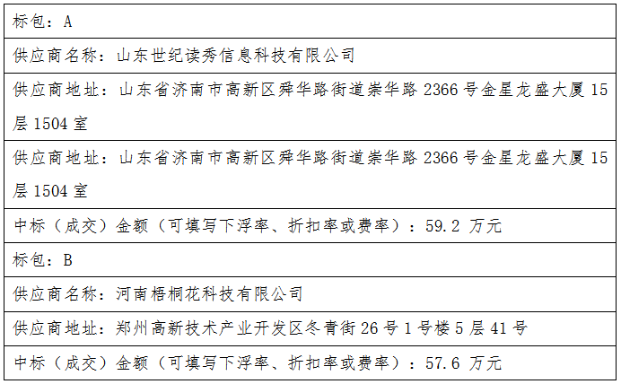 标包:A 北京网梯科技发展有限公司(85.12、86.12、87.12) 河南梧桐花科技有限公司(87.08、92.08、88.08) 山东科睿信息技术有限公司(59.62、53.62、63.62) 山东时习教育科技有限公司(69、53、71) 山东世纪读秀信息科技有限公司(87.65、92.65、88.65) 上海智慧知到网络科技有限公司(85.2、85.2、82.2) 智博数字科技(山东)有限公司(76.32、67.32、76.32) 标包:B 北京网梯科技发展有限公司(87、88、89) 河南梧桐花科技有限公司(88.79、93.79、89.79) 山东世纪读秀信息科技有限公司(89.12、92.12、90.12) 上海智慧知到网络科技有限公司(88、88、85) 智博数字科技(山东)有限公司(78.77、69.77、78.77)